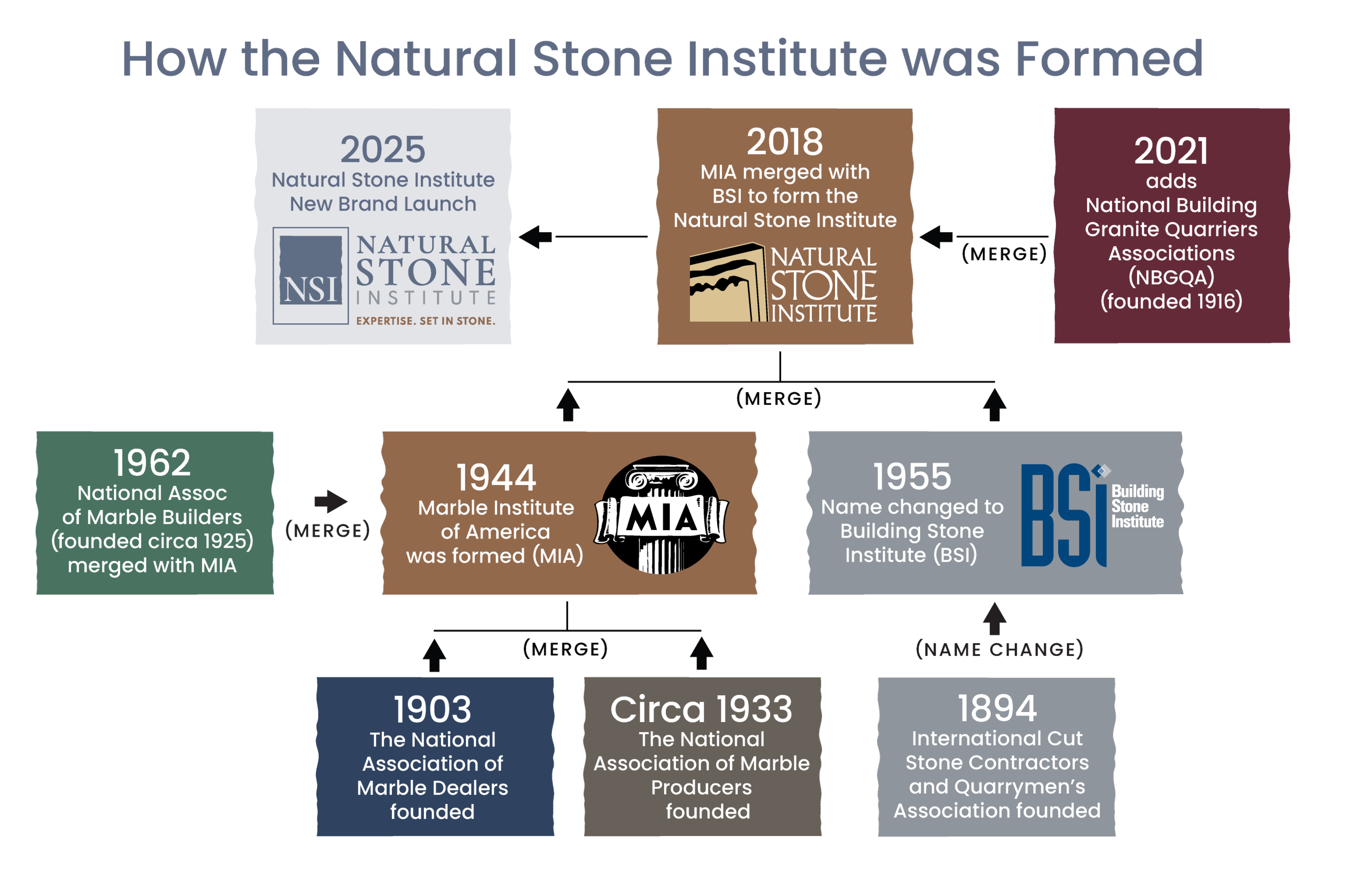 Notably, in 2018, BSI and MIA combined to form NSI. In 2021 the National Building Granite Quarriers Association (founded in 1916) merged with the Natural Stone Institute.