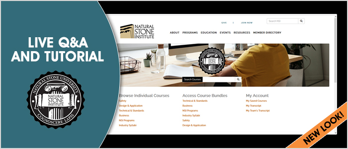 Have a question about how your company can utilize the Natural Stone University as an employee training and workforce development tool? Join NSI Education Manager Aaron Dahnke for a live Q&A session and tutorial of our platform. Bring questions for this interactive session and learn how to find courses, create an education plan for your employees, and track progress across your company. Join at any time during the two-hour period to ask questions and gain a better understanding of the platform.