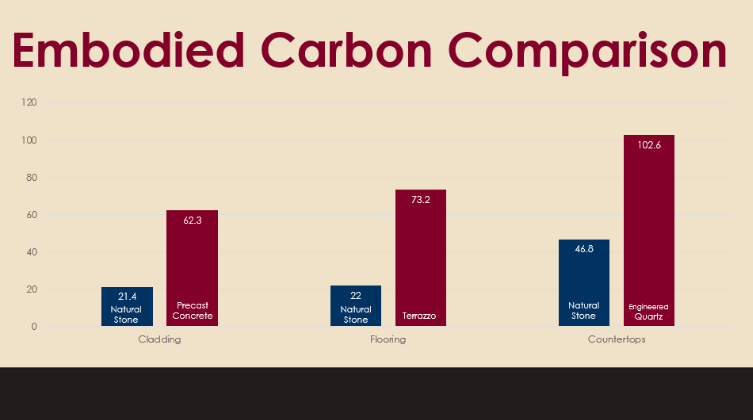 - Compare natural stone’s embodied carbon to other building materials including terrazzo, pre-cast concrete, and engineered quartz.
