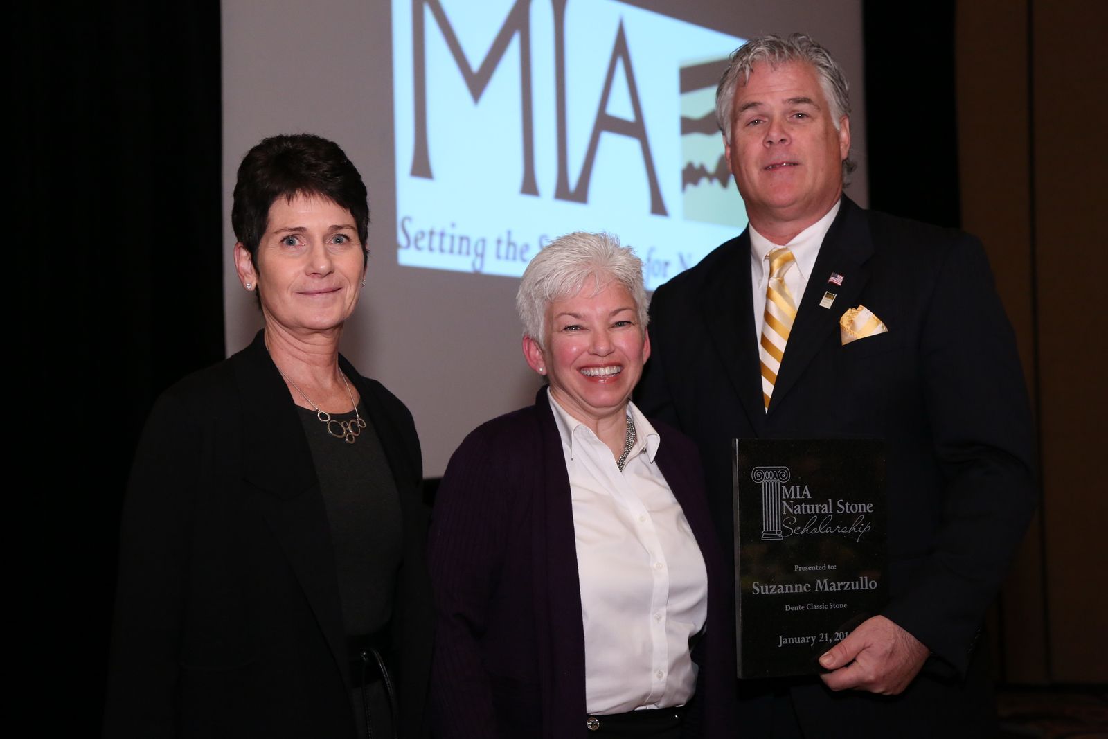 Suzanne Marzullo (center) accepts the 2015 MIA Natural Stone Scholarship Award from award sponsors Kathy Spanier (Coldspring) and 2015 MIA President Dan Rea (Coldspring).